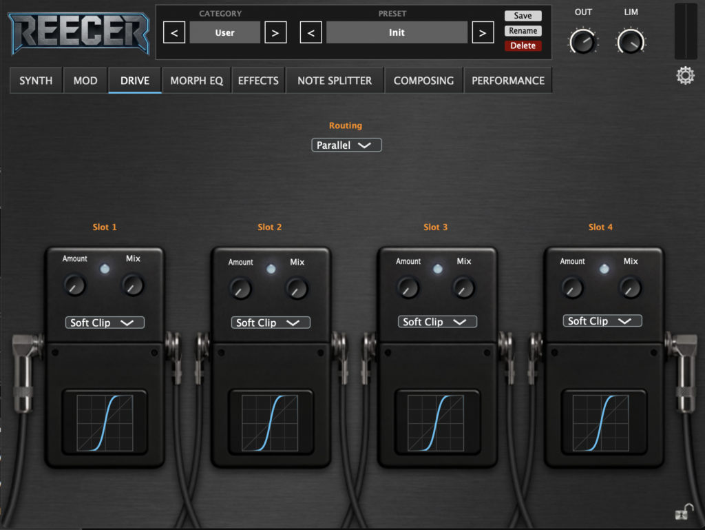 Die vier Slots lassen sich seriell oder parallel schalten. Seriell für aufbauende Sättigung, parallel für komplexe, vielschichtige Distortion.