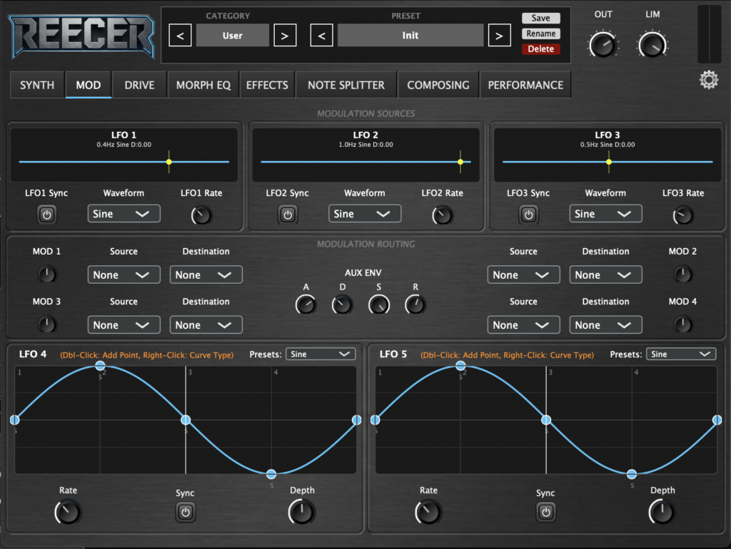 15 Modulation Sources: Fünf LFOs – LFO 1 bis 3 mit klassischen Waveforms (Sine, Triangle, Saw, Square, Sample & Hold, Noise), frei wählbare oder Host-synchronisierte Rate. LFO 4 und 5 sind frei zeichenbar wie in Serum – sechs Curve Modes (Linear, Smooth, S Curve, Exponential Up/Down, Steps) und über 25 Presets von simplen Grundformen bis zu komplexen rhythmischen Patterns wie Trance Gate, Sidechain, Breakbeat oder Dubstep.