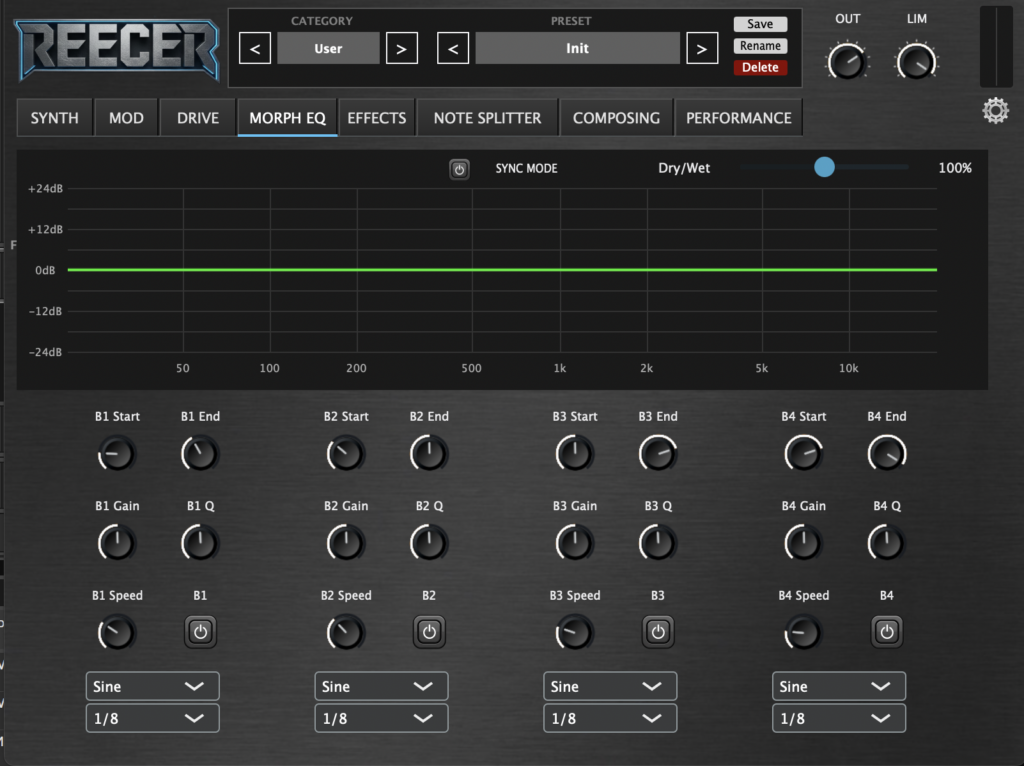 Der Vier-Band Morph EQ ist kein gewöhnlicher Equalizer. Jedes Band bewegt sich über das Frequenzspektrum – von einer Start- zu einer Zielfrequenz, gesteuert durch wählbare Waveforms und synchronisierbar zum Host Tempo.
