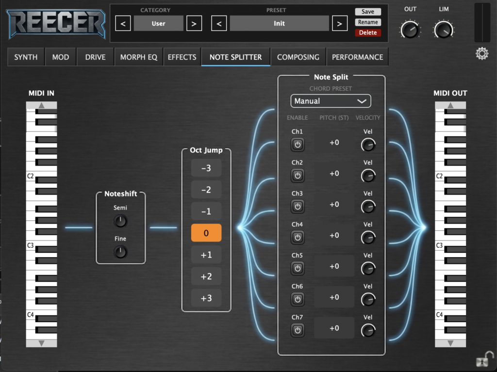 Der Note Splitter macht aus einzelnen MIDI Notes komplette Chords mit bis zu 7 Voices. Signal Chain: MIDI Input → Noteshift → Octave Jump → Note Split → MIDI Output.
